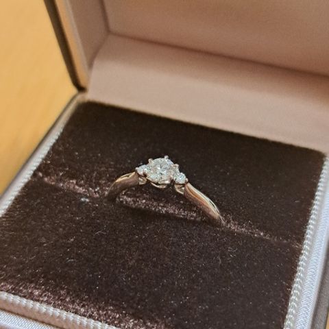 フルオーダーで作成いただいた婚約指輪。0.5ctのダイヤモンド(Dカラー、VS1)が中央にあります。メレダイヤモンドも沢山周りに付けていただいて、理想の指輪ができました。店長がとても親切に自身の指輪イメージをデザイン化してくれて、サンプルの作成までスムーズに行っていただけました。価格帯も予算の60万円以内でとても満足しました。
