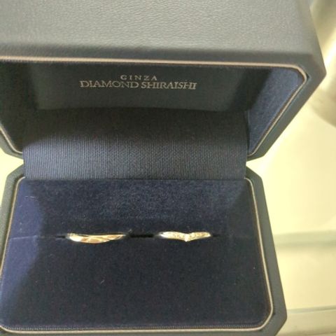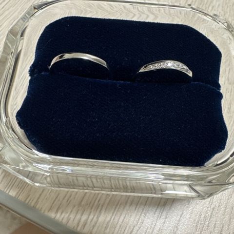 ダイヤが斜めに入っていて、キラキラしていてとってもきれいな指輪。旦那さんの方がリングが太めで一目惚れしました!即決で決めていましたが、たくさんみた中で斜めにダイヤが入り、指も長く見えたため私も納得して選ぶ事ができました!