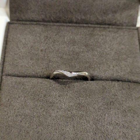 シンプルなデザインで、仕事中は裏返してダイヤが見えないようにもできます。 指輪が回りやすい指ですが、ウェーブのついた指輪で、指がすらっとして見える形を選んでいただきました。 リングが丸まっているので日常生活をしていても痛くならないです