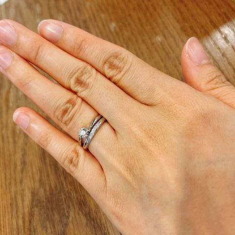 シンプルなデザインで普段も付けやすく、且つ柔らかさや可愛らしさがある形がお気に入りです。スタッフの方に、2人が手を取り合っているようなデザインだと説明していただきとても素敵だと思い、こちらに決めました。