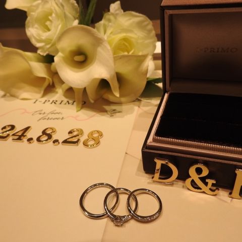 指輪はシンプルなもので、新婦の方がストレートの指輪に斜めにダイヤが入っているものを探していました。そのようなデザインでは、ほとんどの指輪が、単純にダイヤが斜めに入っているのに対し、選んだものは2本のリボンが交差するような形になっていて、そこに斜めにタイヤが入っている、ユニークなデザインです。新郎の指輪もタイヤはありませんが、同じ形になっていて、気に入りました。また着け心地も、とても良いです。