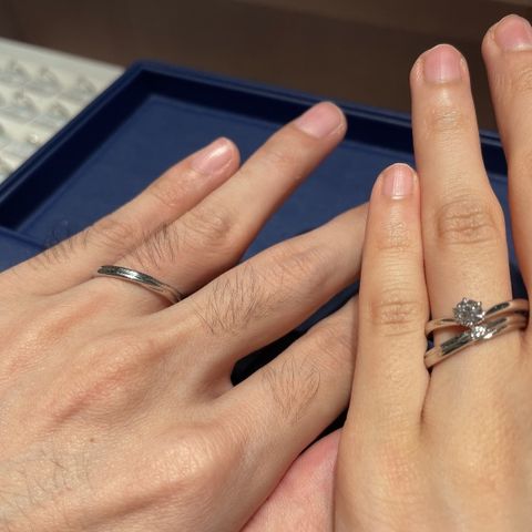 2人の指の形にはストレートが似合うということで、自分たちの好みとも合致していました。ストレートでダイヤが5石入ってるもの、男性のもシンプルだけどラインなどデザインがあるものを求めていました。2人の指輪がペアでなくてもいいと思っていましたが、偶然にもペアのになってとっても満足です。