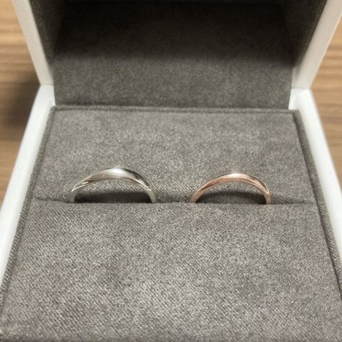 人とあまり被らない指輪が良くてV字の形にしました。 お互いの理想の指輪のデザインが全然違って大変でしたが、いろいろな提案をいただき、お互いの理想のデザインとなりました。着け心地も良く見た目も可愛くかっこよくシンプルでいい結婚指輪になりました。