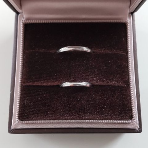 自分(夫)好みのマット感とツヤ感が良い。 妻の指輪は全体的にツヤ感が有り、キラキラと輝いている。 二人同じ形の指輪ながら、お互いの理想の指輪を作成して頂いた。 つけ心地も大変良く、内側に好きな刻印を掘って頂き最高の指輪になった。