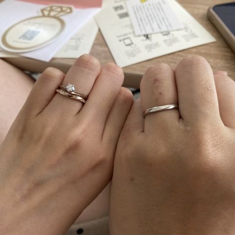 こちらの指輪のデザインは私たち二人の骨格やお肌にあったデザインになっており、どの角度からでも美しく上品に見えます。つけ心地も大変良く、アクセサリーをつけ慣れていない私でもすぐに指に馴染み違和感なく過ごせています。お値段は思っていたよりも高くなくとても良心的です。