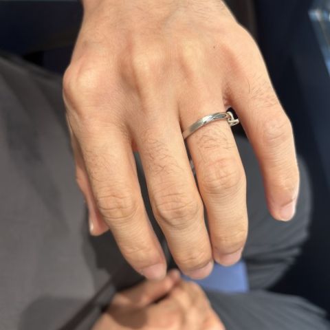 まず1度指の長さ、深さを測っていただき、そこから似合う指輪の形を出していただきました。私が多汗症なので、汗に強いプラチナの指輪にしました。ライン上にダイヤが入っているのがお気に入りです。着け心地もツルッとしていて、指に馴染む感じがします。