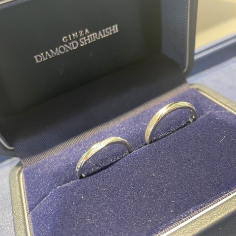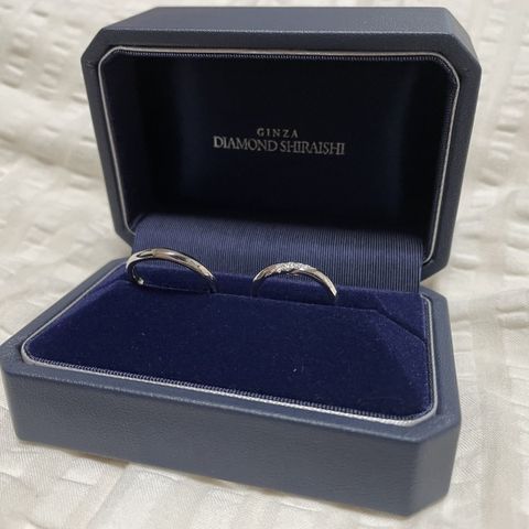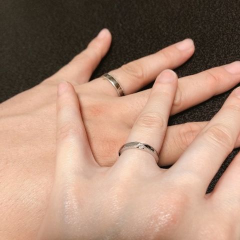 女性の指輪 ワンポイントのダイヤモンドが付いているものはくるくる回って中心がずれそうで嫌だったのですが、 こちらの指輪は緩やかなV字で流れるようにメレダイヤが付いているので多少ズレてもそこまで分からないのが気に入りました。 男性の指輪 初めはストレートラインのものを見ていましたが、試しにV字も試着してみると思ったよりしっくりきていたのでこちらに決めました。 中心にマット加工がしてあり、キラキラしすぎないのが気に入っている様です。