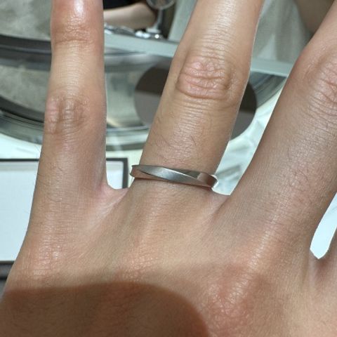 スタッフの方が私たちのイメージで持ってきてくれた指輪です。見た瞬間からとても気に入りました。 つけ心地がとてもいいです。 キラキラしててずって見てられます。 指が長く見えるように少しウェーブがかった所がおすすめです。
