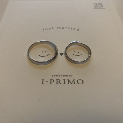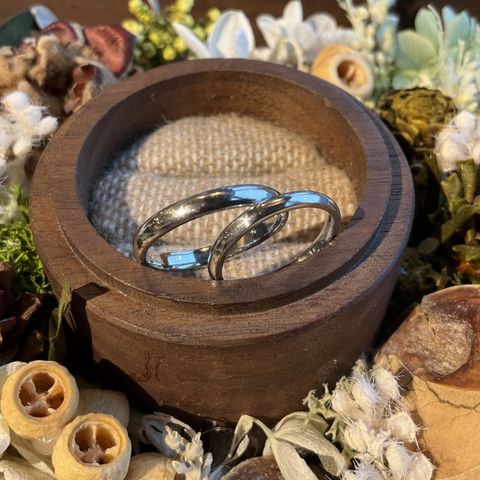 ホワイトゴールドという色味がとても素敵で 購入しました。 女性にも男性にも身につけやすい色だと思います。 全面鏡加工をしていただき、裏面にレーザー加工で 二人のイニシャルと入籍日を刻印していただきました。