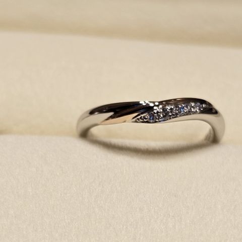 婚約指輪にも入れたピンクゴールドを金線として斜めに入れていただき、 それに沿ってダイヤをはめていただきました。 ダイヤのはめ方の形や金線の角度など、とても細かく打ち合わせしていただき、シミュレーションの用紙なども作っていただいたので理想と差異のないとても可愛いものができました