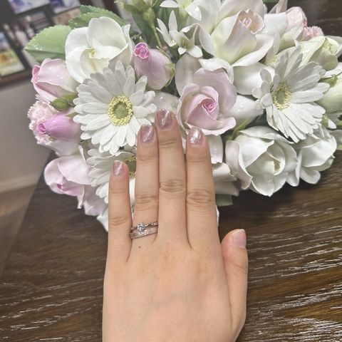婚約指輪は一目惚れしたデザインを購入。 結婚指輪は担当してくださった方が 婚約指輪と重ね付けしたときに合う デザインの指輪を提案していただき購入。 着け心地も良く、デザインも可愛いので ずっと指輪を眺めているくらい気に入っています。