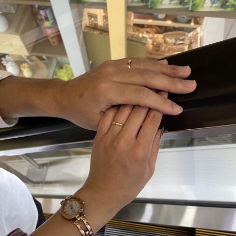 着け心地が良く、シンプルなデザインで一生飽きが来なさそうなデザインです。内側にダイヤモンドを埋め込んで、外した時だけ見えるようにしました。2人で全く同じデザインで作れて嬉しかったです。若干太めの指輪で、おじいちゃん、おばあちゃんになっても似合うイメージで選びました。