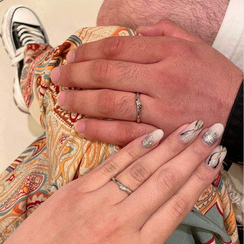 仕事中も着けたかったので、デザインはシンプルで普段使いしやすいものにしました。自分たちの手の形からウェーブ型の指輪が合っていると言われ、実際につけてみると他の形よりも付け心地が良くこのデザインに決めました。