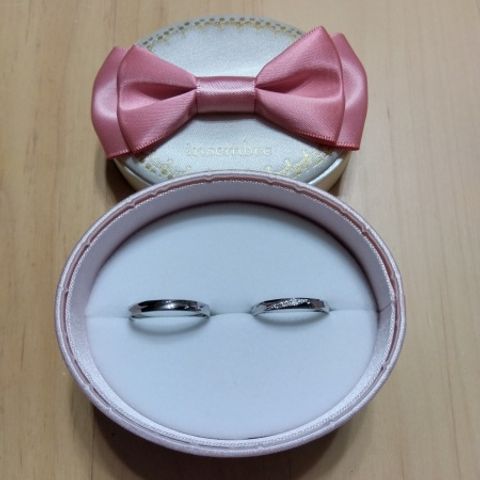 女性用はウェーブがかかっており、ダイヤが5粒・斜めにぐるっと入っています。そのため、指輪をどの角度から見てもダイヤを感じることができます。さりげなく、かつキラキラしているところが気に入っています。 男性用はシンプルなリングです。
