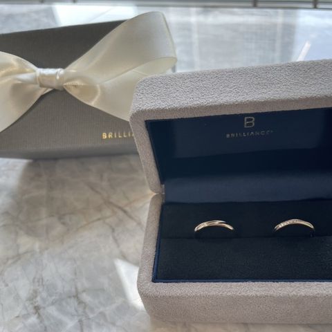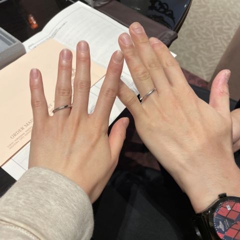 新郎の指輪はシンプルですが、よく見るとカーブが入っていておしゃれです。太すぎず細すぎないサイズで満足しています。 新婦の指輪はダイヤが波のように長めに入っていてどの角度から見ても綺麗です。どのような服装にも合うデザインだと思います。