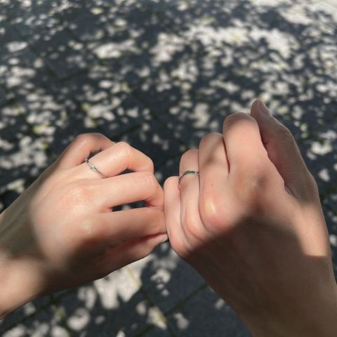 シンプルなデザインの指輪を探したいと2人とも考えていて、ネットや友人の紹介などからアイプリモさんのノクターナルという指輪を見つけました。 ノクターナルは、少しウェーブのかかった形をしていて、2人の手の形にもフィットするので気に入っています。