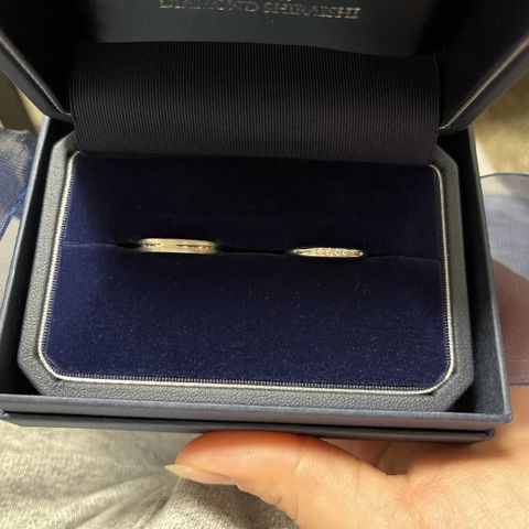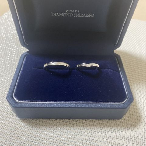とてもシンプルなデザインで、飽きのこない感じが良いなと思いこの指輪に決めさせてもらいました。女性側の指輪には小さいながらも最高クラスのダイヤがさりげなく、しかしキラキラと存在感もありとても良いと思いました。