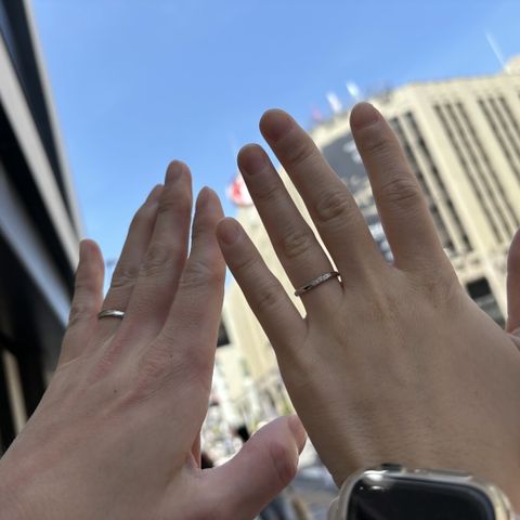 細身で付け心地がとても良いです。あまりダイヤモンドなどの装飾がなくシンプルなものを探していたので、こちらのデザインはぴったりでした。シンプルの中に少し自分たちらしさが欲しかったので、つるんとしたデザインではなくカクカクとしたデザインに一目惚れしました。