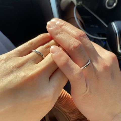 私の骨格に合うV字タイプの物をお探ししておりました。どこも似たようなデザインになりがちでしたが、こちらは店舗限定でかつ、男性物も特徴があって、二人の好みを探せたのはとても良いと思いました。あえてペアリングにしない、という選択が私達の特徴です!