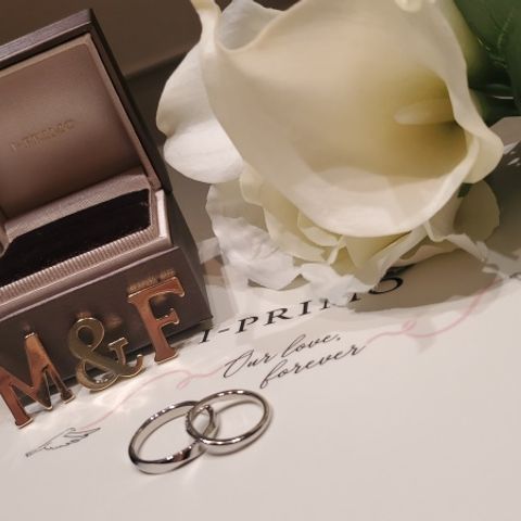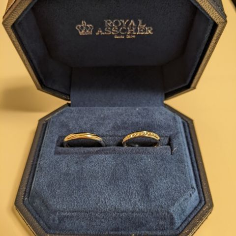 互いに相手の指輪を作成しました。指輪の内側にはお互いの誕生石、レーザーで刻印した手書きのメッセージが入っています。作成にあたり、専任のスタッフの方が相談にのっていただき、こだわりも反映させていただきました。当日作成した原型を元に一か月程度で納品されました。制作時の時の写真や動画もいただけ、一生の思い出になりました。ありがとうございます。