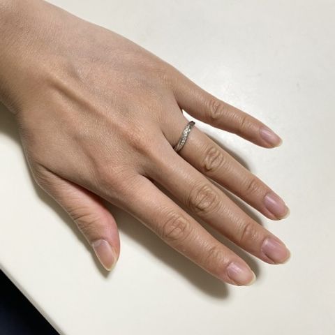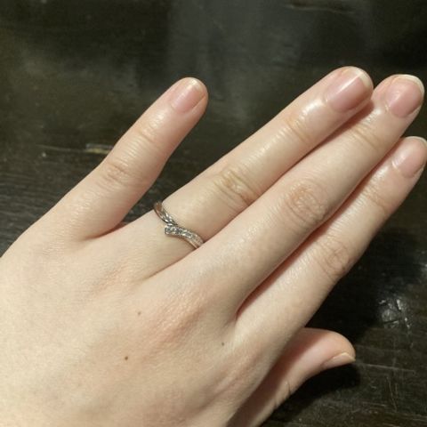 着けた瞬間にこれだ!!!と思いました。 緩やかなカーブが付いたデザインで、さりげないダイヤも目立ちすぎずで、自分の希望通りでした。 着け心地が、ほんとうに良くて、いい意味で付けてる感じがしないくらい、指にフィットしています!