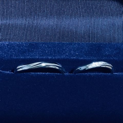 婚約指輪と重ね付けが出来るよう、ダイヤモンドの配置が同じ流線状になっているデザインを選びました。普段からつけるものなので、派手過ぎず、でもかわいいデザインだと思います。新郎のリングは艶消し加工が施されており、渋くて素敵です。