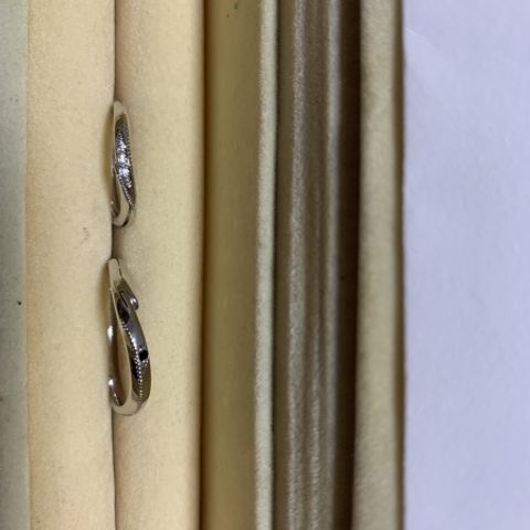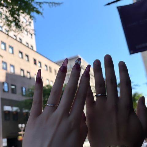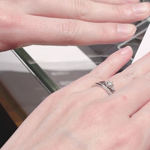 デザインがシンプルなのに綺麗で着け心地がとてもよいです。1番最初に自分達の系統と手や指の診断をしていただいたので、自分達の手や雰囲気にしっくりくる指輪が見つかりました。婚約指輪との重ね付けもできるのでとても満足しています。
