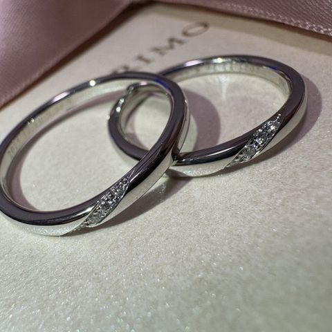 ゆるやかなカーブがついているので、水かきが深い人の指に似合うそうです。小さめのダイヤモンドが4〜5個程度付いているので明かりの下で見るととてもキラキラしていて上品で綺麗です。また、男性用の指輪も斜めのデザインが入っており、シンプルながらもデザイン性がある所が良いと思います。