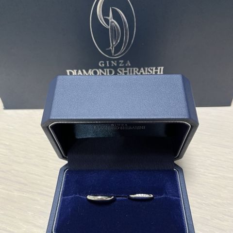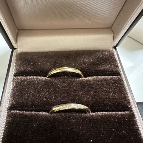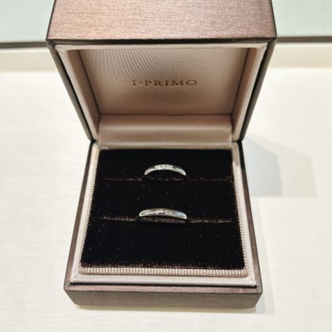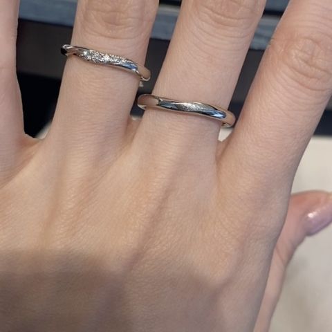 シンプルですがダイヤの存在感もしっかりあり、可愛くて一目惚れしたデザインです。ウェーブラインの柔らかい雰囲気も出て、見え方も綺麗で気に入っています。男性用もマット加工をしてもらっており、オシャレです。