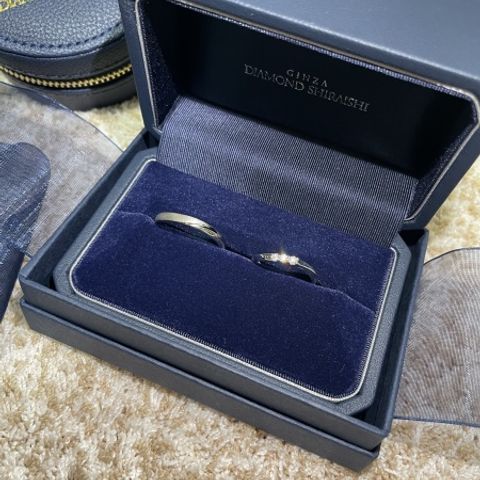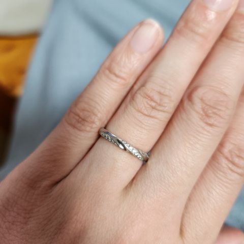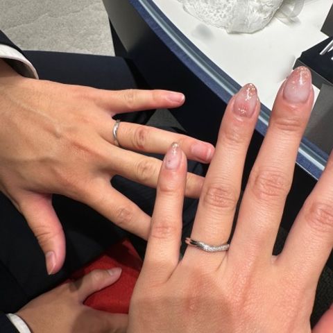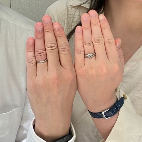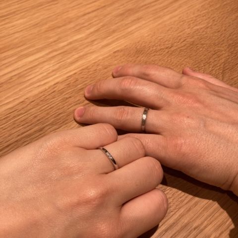 ペアリングではなく、それぞれが好きなデザインで選びましたが、とても満足しています!必ずしも同じデザインじゃなくても良いと思います♪一生着けるものなので、お互いが気に入ったものを選ぶのが一番です。ペアでなくても結構馴染みます。