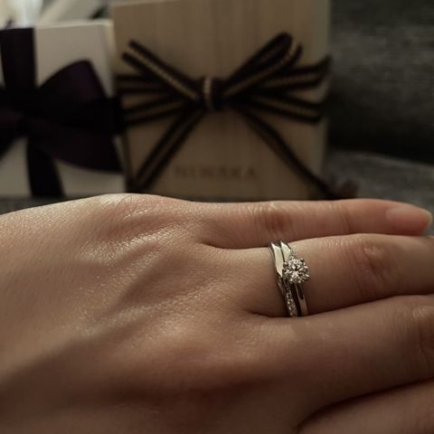 さすがセットリングだから婚約指輪と結婚指輪がピッタリ重なって、せっかくの婚約指輪も特別な時は重ねづけしたいなと思って選びました。リングがゴツゴツしていないから装着感もよいです。木漏日とせせらぎのダイヤモンドが繋がる感じが気に入りました。