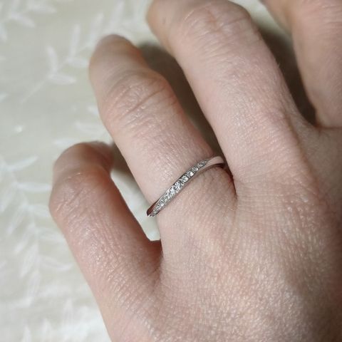 婚約指輪も重ね付けしたり普段使いしたいという思いから、ハーフエタニティを選びました。ハーフといっても3/4くらいダイヤが付いていて少し回っても綺麗に着けれそうです。決め手は着け心地の良さです。レール留めで引っかかりもなく、幅、厚み、角の丸みがちょうど指に馴染みました。何回見ても輝きにうっとりします。