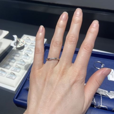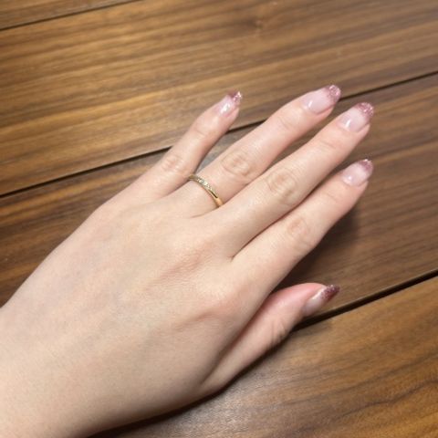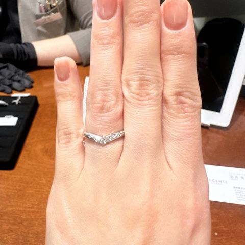 指を長く見せてくれるV字型で探していました。店舗で見たときにデザインが気に入り、真ん中のラインをマット加工のピンクゴールドに変更。シンプルなデザインのものとすごく迷いましたが、少しデザインの特徴があるものがいいと思い、今では大満足です!