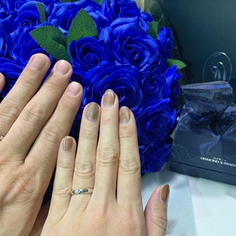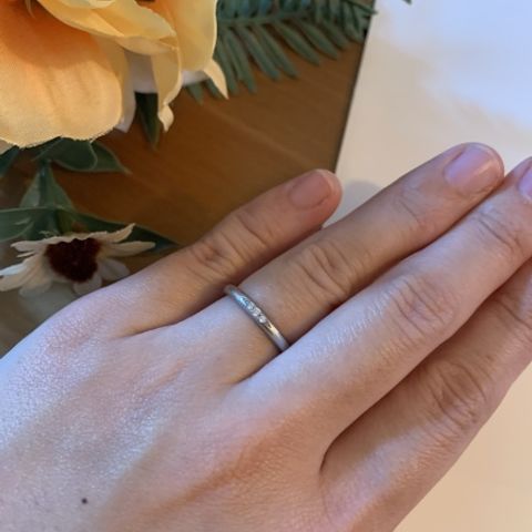 ウェーブラインが合っているようで指が綺麗に見えます。さりげないダイヤモンドが素敵です。旦那のはマット加工を入れてもらっています。お互いの似合うものになっており、大変満足しています。可憐さとしなやかさどちらも兼ね備えています。