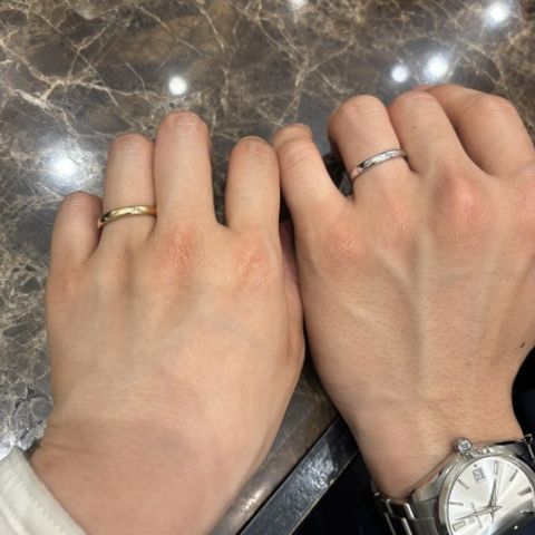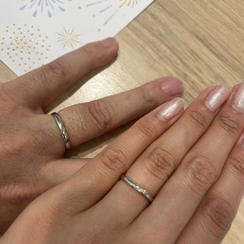 ラインが入った所を合わせてペア感を出しました! 最初はダイヤの入っていない物で探していたのですが、ダイヤモンドシライシさんはダイヤモンドにこだわっているという事もあり、試着したらすっかりダイヤモンドに目移りしてしまいました!