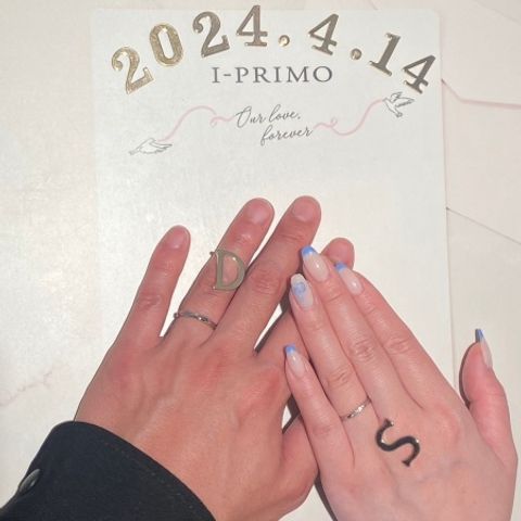 普段指輪をあまり着けないタイプだったので、シンプルなものにしました。誕生石12個から2人で3つまで好きなところにつけられます。お互いの誕生石を交換で内側に、私の方の表にダイヤを入れました。刻印も無料だったので、お互いのイニシャルを内側に入れました。
