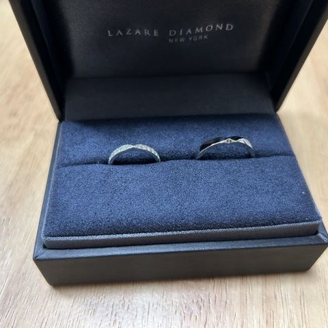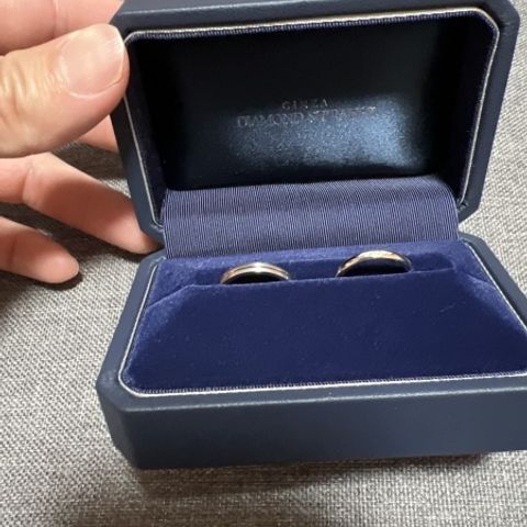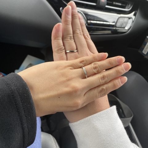 夫の希望もあり、婚約指輪と同じお店にしました。 毎日つける結婚指輪にもダイヤモンドがついてるものが希望だったので、スタッフの方が見繕って持ってきていただきました。ダイヤモンドがありながらもプラチナの煌びやかなものを選びました。