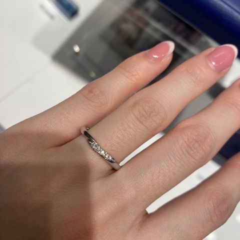 とても繊細なつくりに惹かれました。細身なので派手にはなりにくいものの、ダイヤモンドが屋外でも室内でもキラキラとてもきれいに輝いています。重ね付けをしたい時にも、どんな指輪とも合わせられると思いました。
