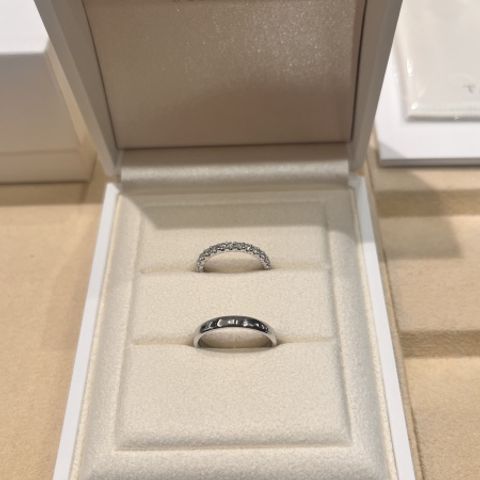 私はハーフエタニティリングが良かったのですが、こちらの爪留めのタイプ(ピアチェーレ)と彫り留めのタイプ(スペランザ)の2種類で迷っていました。 デザインの好み的にはピアチェーレが華やかで好きだったのですが、毎日使用することを考えると、引っ掛かりにくくて使いやすそうなスペランザの方が良いかな…と 悩んでいると、スタッフの方が、こちらのピアチェーレの方をおすすめしてくださいました。 結果的に、こちらを選んで正解でした。キラキラ輝いていて、毎日着けながら眺めているだけで気分が上がります。 メンズ用は、ピアチェーレとスペランザ2種類をご紹介いただきました。ピアチェーレは丸みを帯びたデザインで、スペランザは少し角ばった印象のもので、こちらも ピアチェーレにいたしました。 ダイヤの付いていないものは恐らく男女兼用なので、指のサイズにかかわらず、好きなデザインや太さが選べるのは大きいです。 主人は指が細めなので27mmでピッタリでした。