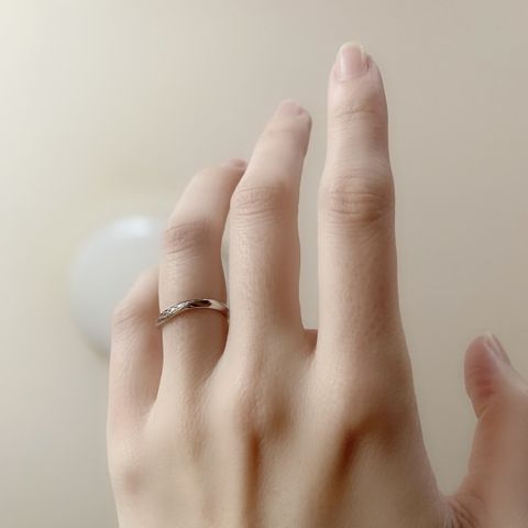 なんといっても着け心地がよかったです。すごく指に馴染む感じでした。ダイヤモンドの入り方もさりげなく、ギラつきすぎなきのがよかったので、まさに理想通りの指輪に出会えました。ひねりが入っているので見る角度によってはストレートに見えたり、緩いV字のようにも見え飽きが来ないデザインかなと思います。