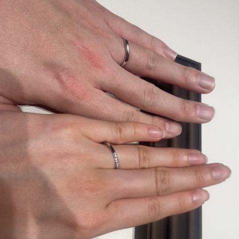 デザインが斜めに入っているものがよかったのですが、男性用も女性用も好きなデザインでした。女性用はダイヤが2カ所に並んでいるので、どこから見ても輝いて見えるのがとても良いポイントです。男性用も一部に光沢消しを入れられるのでオシャレに見えます。指にも馴染みやすく、着け心地も抜群です。