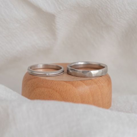普段身に付けているヴィンテージの指輪と調和するシンプルなデザインが気に入っています。 形や太さ、デザインはそれぞれ似合うものが良かったので、どうしようかと悩んでいましたが、素材や加工など質感だけ揃える提案をしていただきこのデザインに決めました。