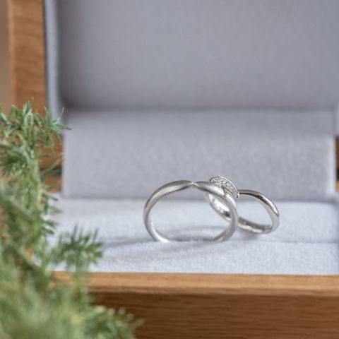 ブライトボヤージュの婚約指輪を先に購入していたためセットで使えることを前提に選びました。 他の結婚指輪も合わせてみましたがやはりセットで着けるにはこれが1番素敵でした。 流れるようなデザインが素敵です。 男性用の指輪にはマット加工をしています。加工することでよりペア感が出ました。