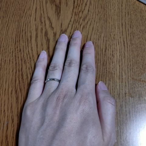 とにかく着け心地がいいです。 内側が滑らかで毎日つけていても違和感がないのが満足です。 内側には刻印とともにプロミスダイヤも入れることができて、見た目はシンプルだけど内側にこだわりもあり、満足しています。