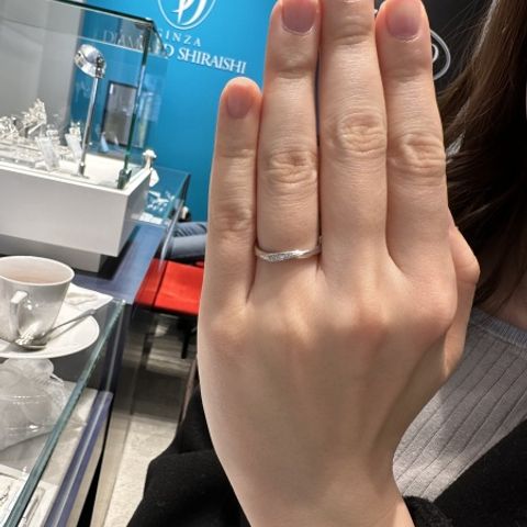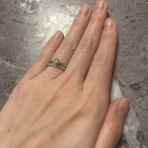 デザインが素敵で、指も綺麗に見える気がします。 指輪に込められた意味も伺うことができとてもよかったです。 華やかすぎず、綺麗で仕事中にもつけることができそうで嬉しいです。 夫婦2人で同じデザインを気に入ったのが決め手となりました。