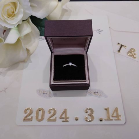 リングのデザインはシンプルに選びました。 普段使いもしたい、婚約指輪感も欲しい、という私のわがままを聞いてくださりたくさんのデザインを試着させていただきました。シンプルながらもプラチナ部分にマット加工がしてあり、アンティークな雰囲気の【ステージ サイドストーンリング】に決めました。とても気に入っています!