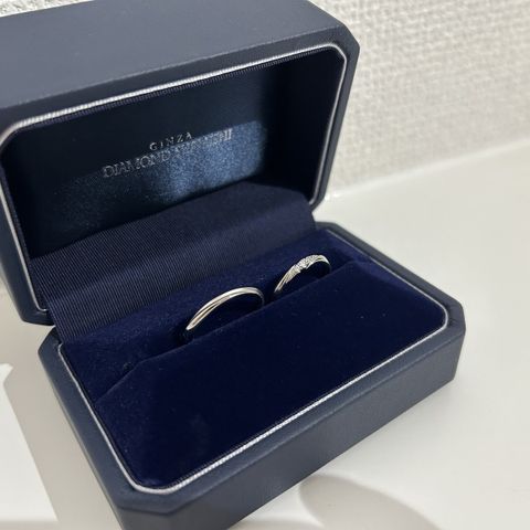 着け心地がよかったです。ダイヤモンドも表面に流れるようについててシンプルだけど派手すぎず、結婚指輪らしいデザインでした。女性用のダイヤモンドはグレードを1番高いものを選び、男性用はつや消し加工をつけておそろい感が増しました。つや消し加工も種類があり選ぶのも楽しかったです。