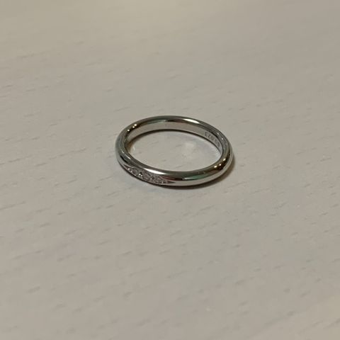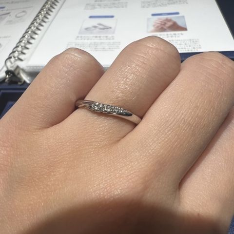 斜めのラインとダイヤが斜めに並んでいて、シンプルであまり主張しないデザインだけど、3つのダイヤがときおりキラキラと光るのがかわいいです。 エンゲージリングとの重ね付けも可能だったので、こちらの商品を選びました。