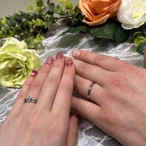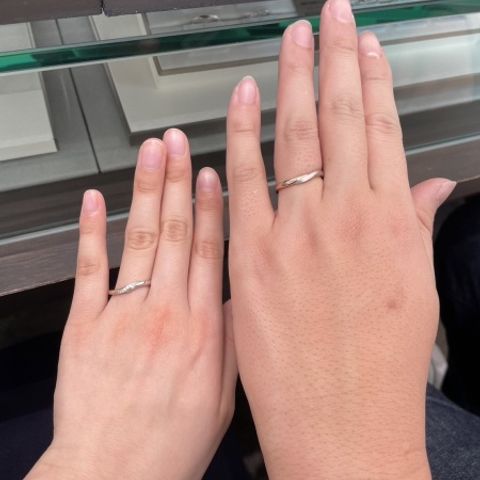 お店で自分の手に合うデザインを診断していただき、結婚指輪はまっすぐな形にしました。デザインが少しウェーブっぽいので、婚約指輪のデザインにも合い、重ね付けもしやすい組み合わせを選べました。婚約指輪はアシンメトリーで、見る角度によって表情が変わり、ダイヤモンドの見え方も綺麗なこちらのデザインにしました。