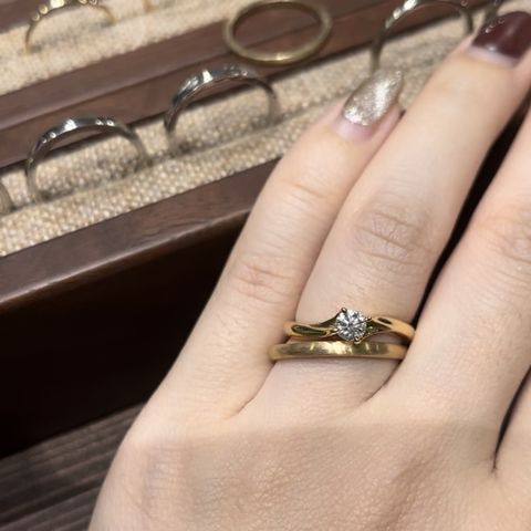ゴールド、そして太め、一見結婚リングにみれないけれど、どんな服装にも合うし、女性らしくて可愛い。これからゴールドが増えていくと思う。重ね付けも何にでも合うので、おしゃれリングとしても、とてもおすすめですよ。